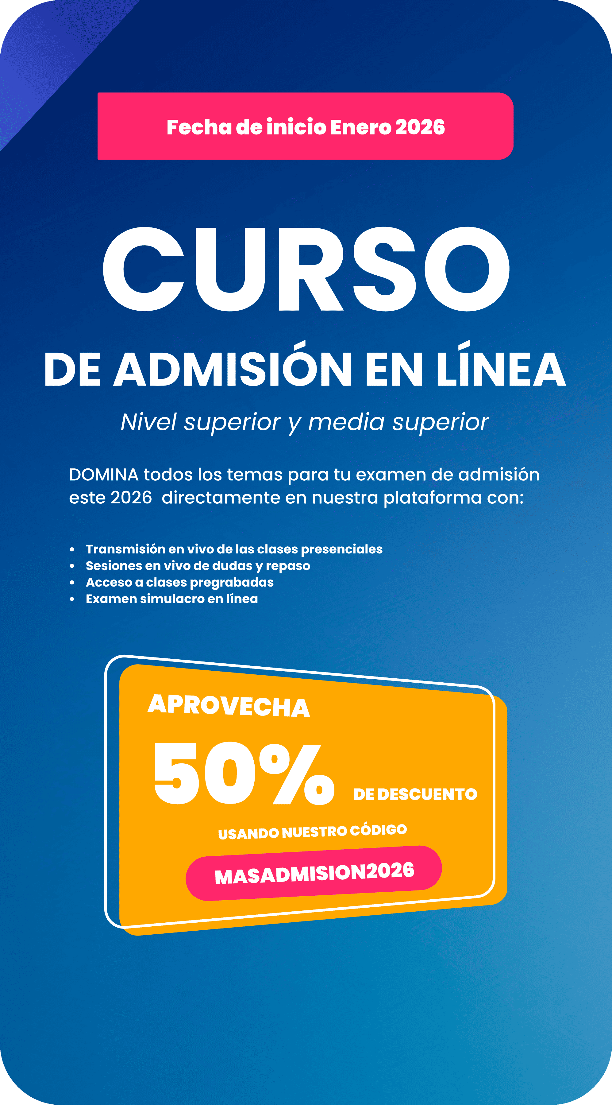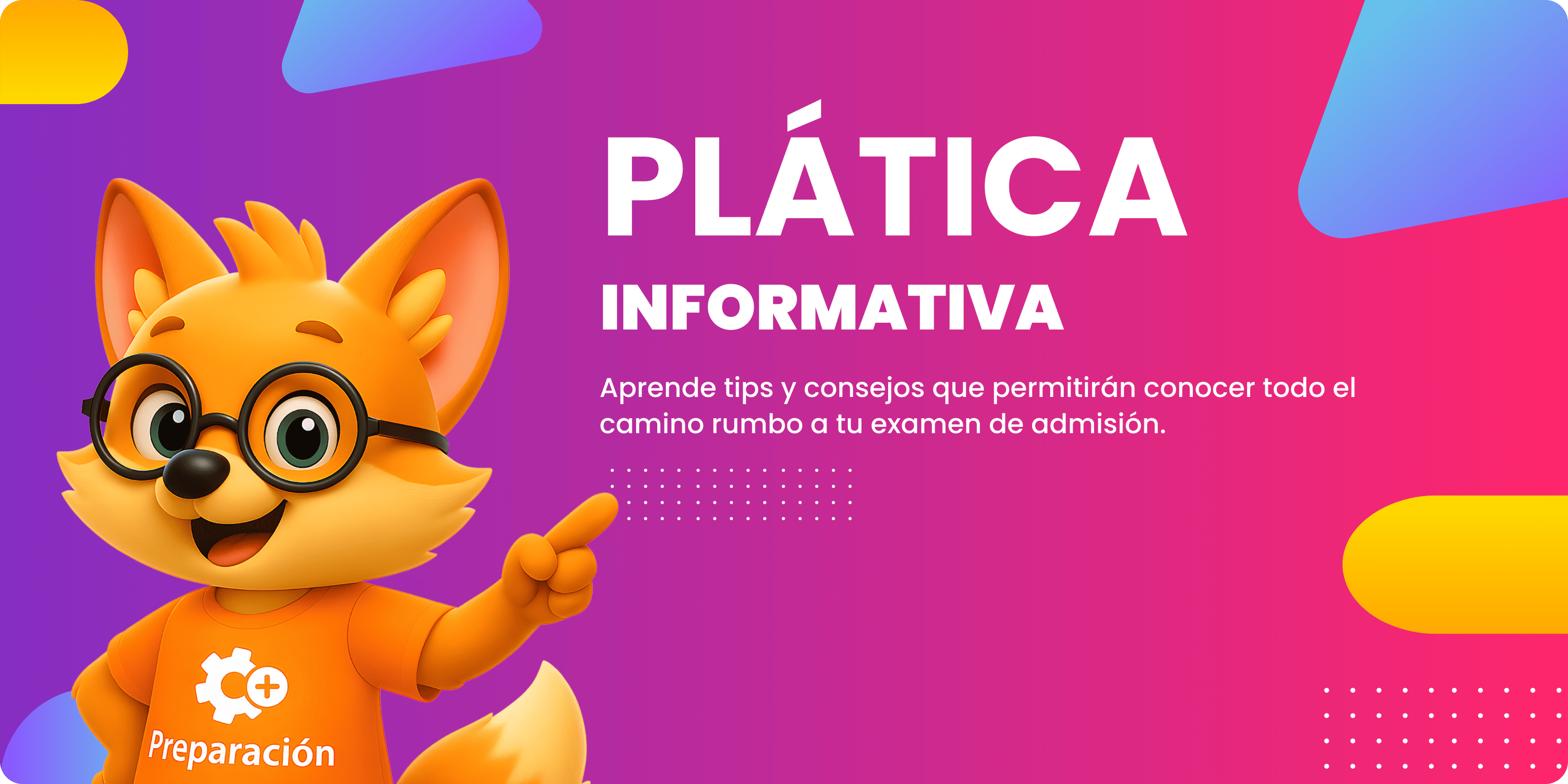 Si quieres ingresar a preparatoria o universidad y no sabes por dónde empezar, esta plática es para ti. Participa en nuestra plática informativa gratuita y entérate de todo: procesos de admisión, requisitos, fechas clave y consejos exclusivos para mejorar tus posibilidades de éxito. Además, podrás realizar un examen simulacro sin costo para conocer tu nivel actual y planificar tu preparación desde ahora.